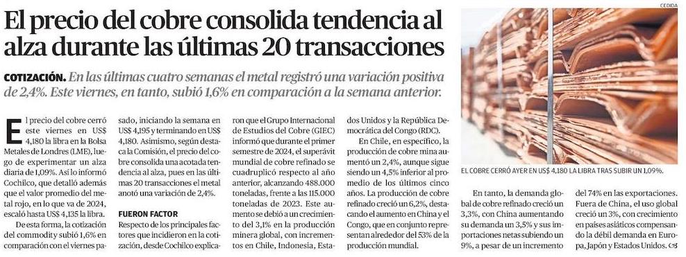 Presupuesto 2025: Un precio del cobre más alto daría holgura para un mayor gasto público en año electoral - (El Mercurio de Santiago)