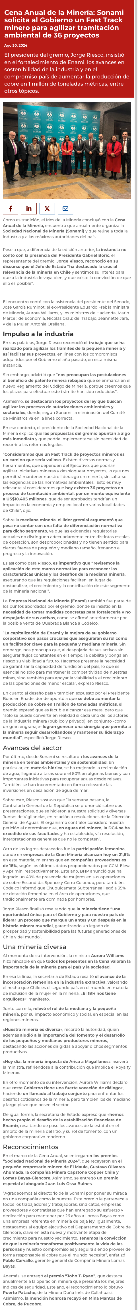 Cena Anual de la Minería: Sonami solicita al Gobierno un Fast Track Minero para agilizar tramitación ambiental de 36 proyectos. - (chanarcillo.cl)