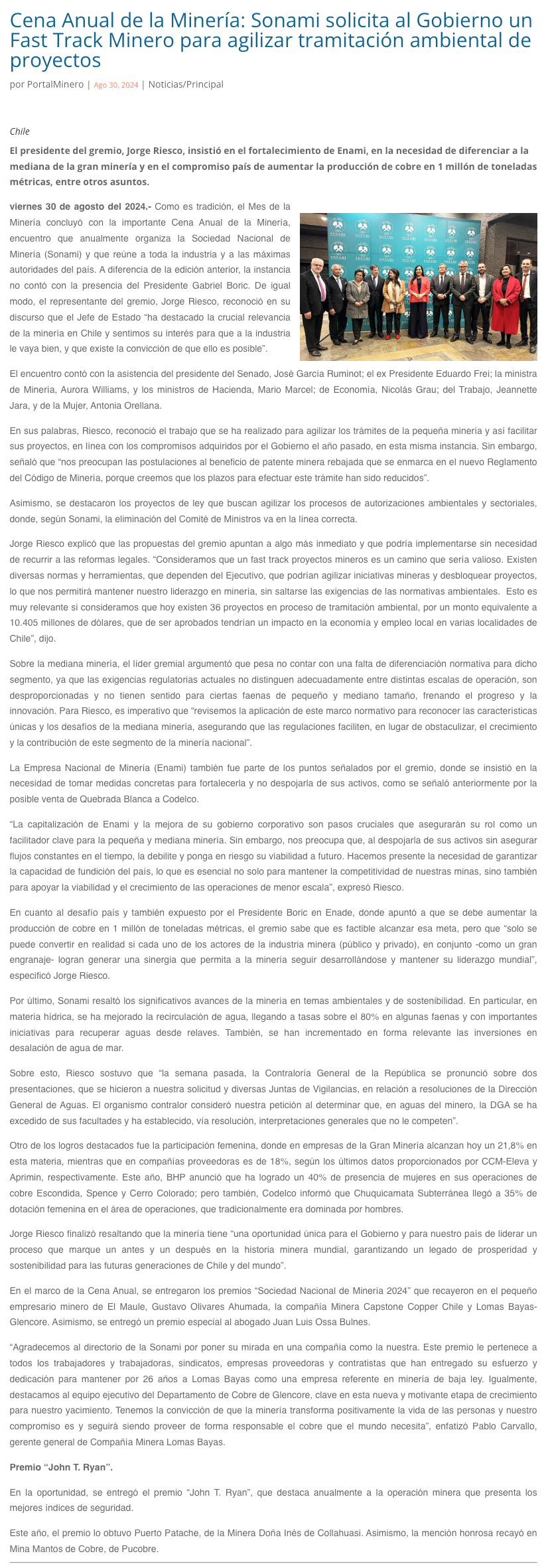 Cena Anual de la Minería: Sonami solicita al Gobierno un Fast Track Minero para agilizar tramitación ambiental de 36 proyectos. - (chanarcillo.cl)