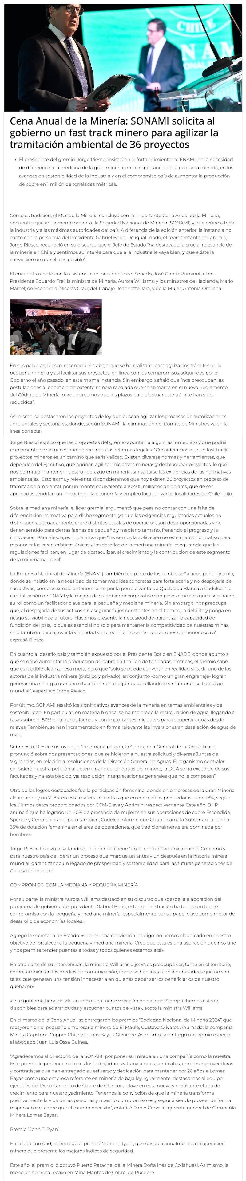 Cena Anual de la Minería: Sonami solicita al Gobierno un Fast Track minero para agilizar tramitación ambiental de 36 proyectos - (mch.cl)