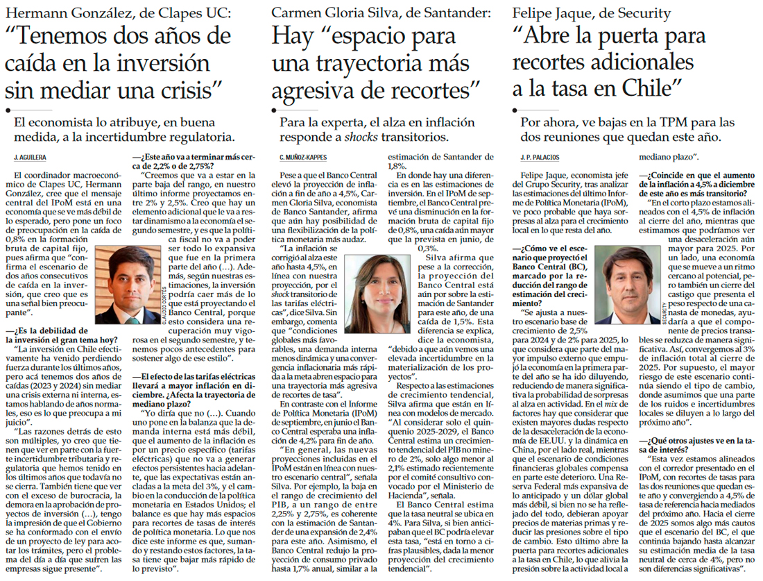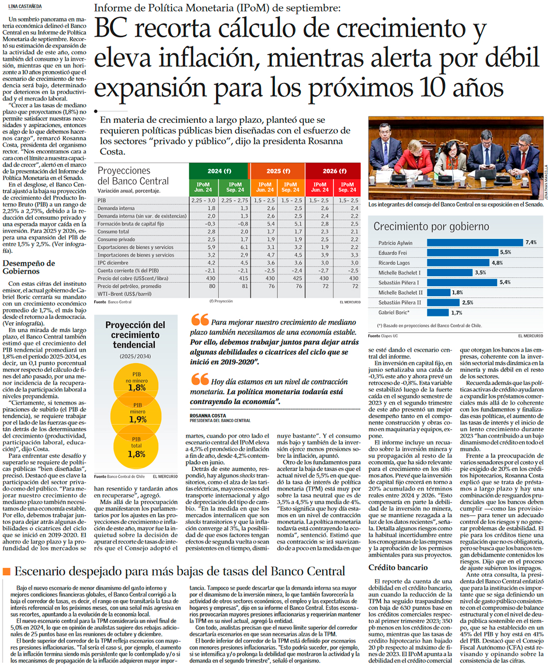 Banco Central baja proyecciones de PIB, consumo e inversión para 2024 y adelanta en un año el regreso de la tasa de interés a su nivel neutral - (Pulso)