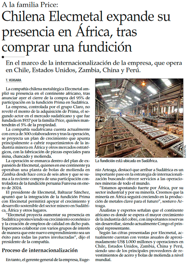 Elecmetal adquiere control de fundición en Sudáfrica y consolida presencia internacional al sumar un quinto mercado fuera de Chile - (Diario Financiero)