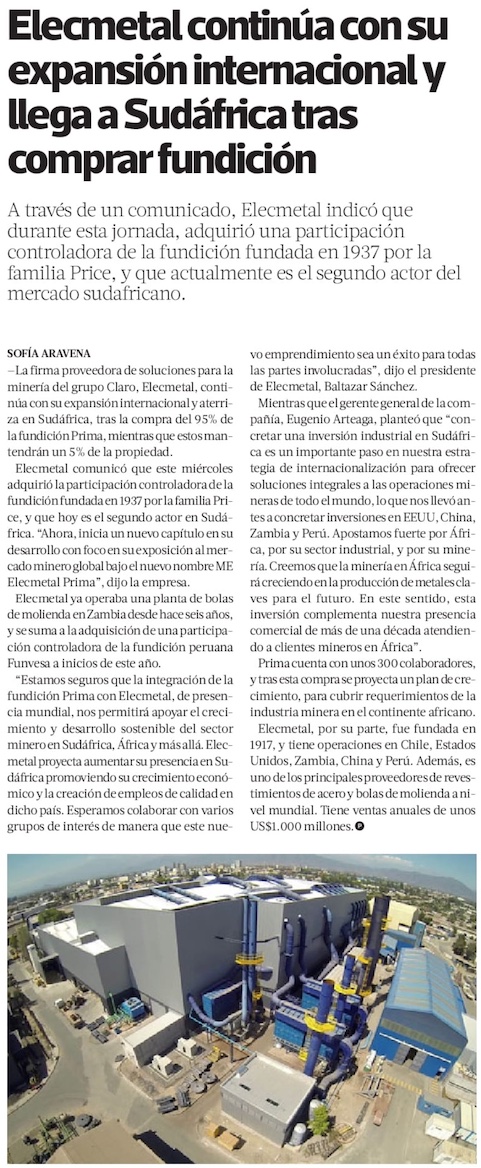 Elecmetal adquiere control de fundición en Sudáfrica y consolida presencia internacional al sumar un quinto mercado fuera de Chile - (Diario Financiero)