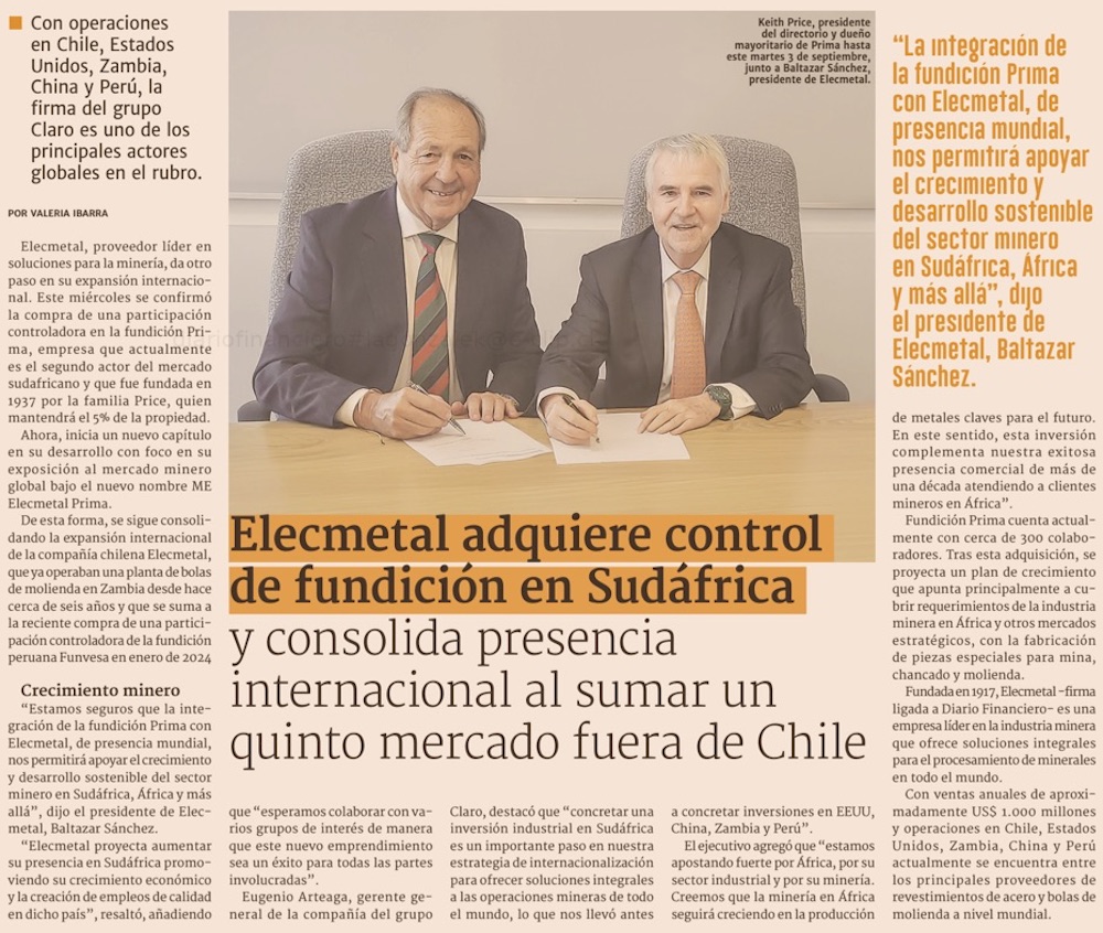 Elecmetal continúa con su expansión internacional y llega a Sudáfrica tras comprar fundición - (Pulso)