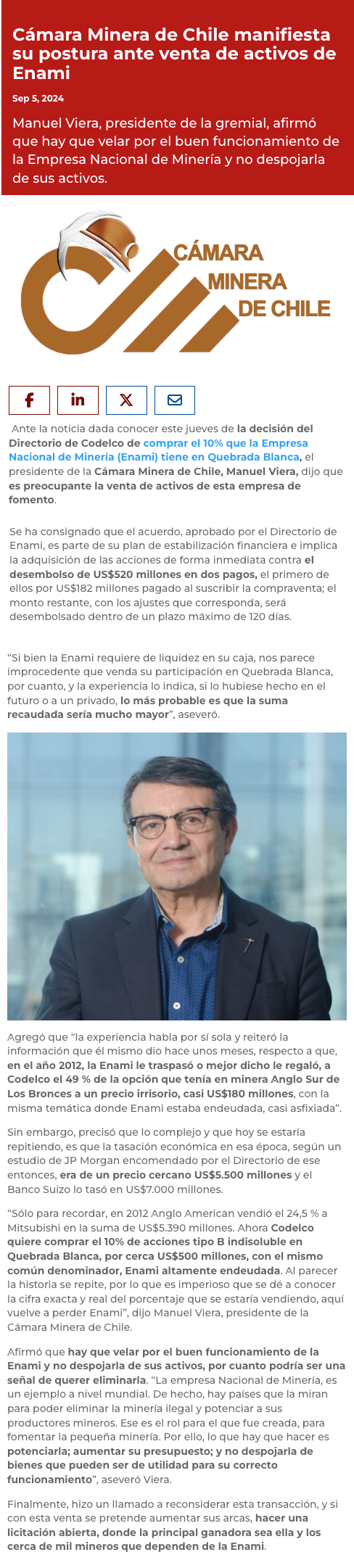 La Cámara Minera de Chile se opone a la venta de activos de Enami - (portalinnova.cl)
