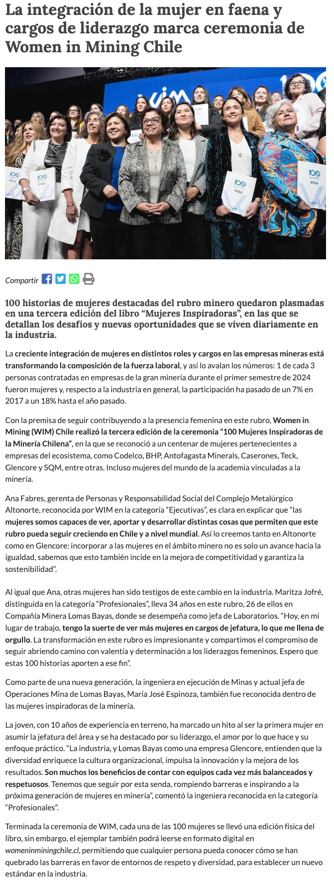 La integración de la mujer en faena y cargos de liderazgo marca ceremonia de Women in Mining Chile - (El Chañarcillo)