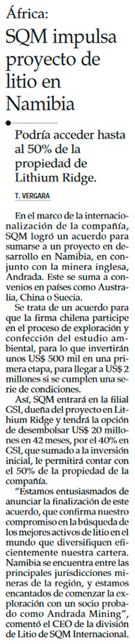 SQM y Andrada Mining se asocian para desarrollar proyecto de litio en Namibia - (reporteminero)
