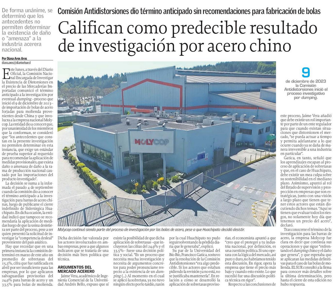 Comisión Antidistorsiones pone fin a investigación por dumping de acero chino - (Diario Financiero)