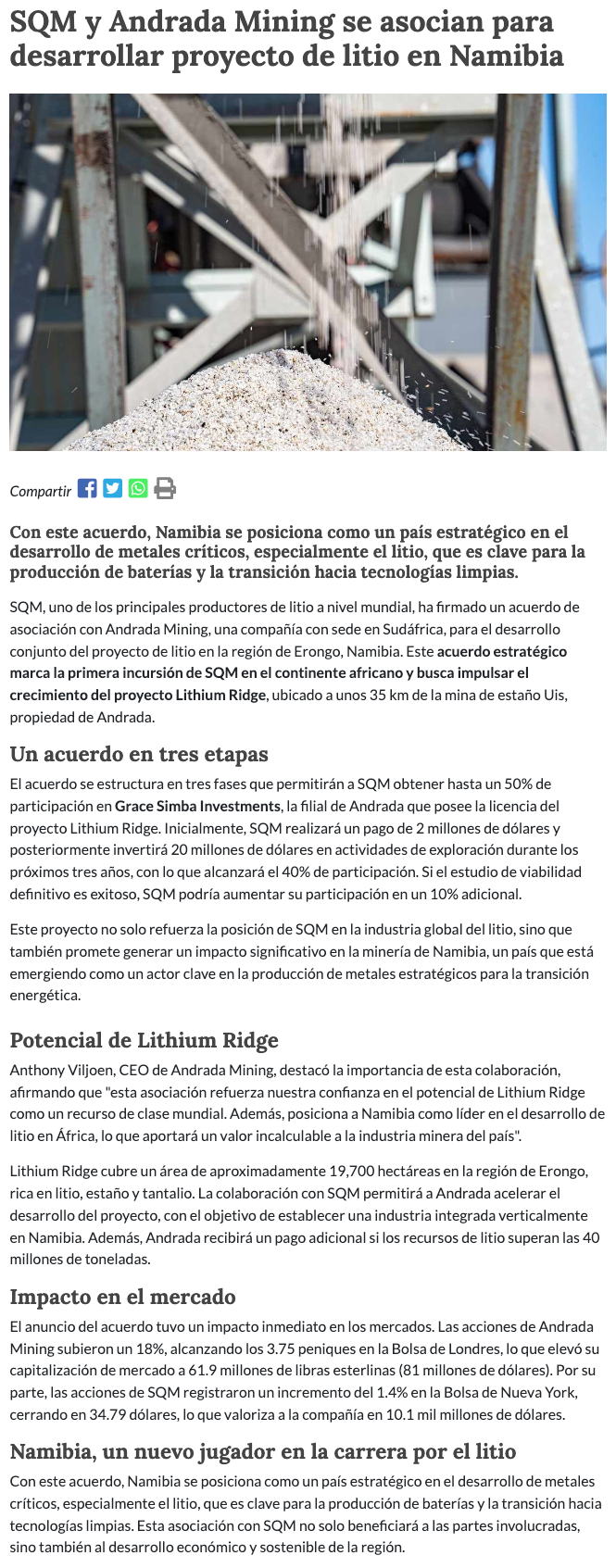 SQM impulsa proyecto de litio en Namibia - (El Mercurio de Santiago)