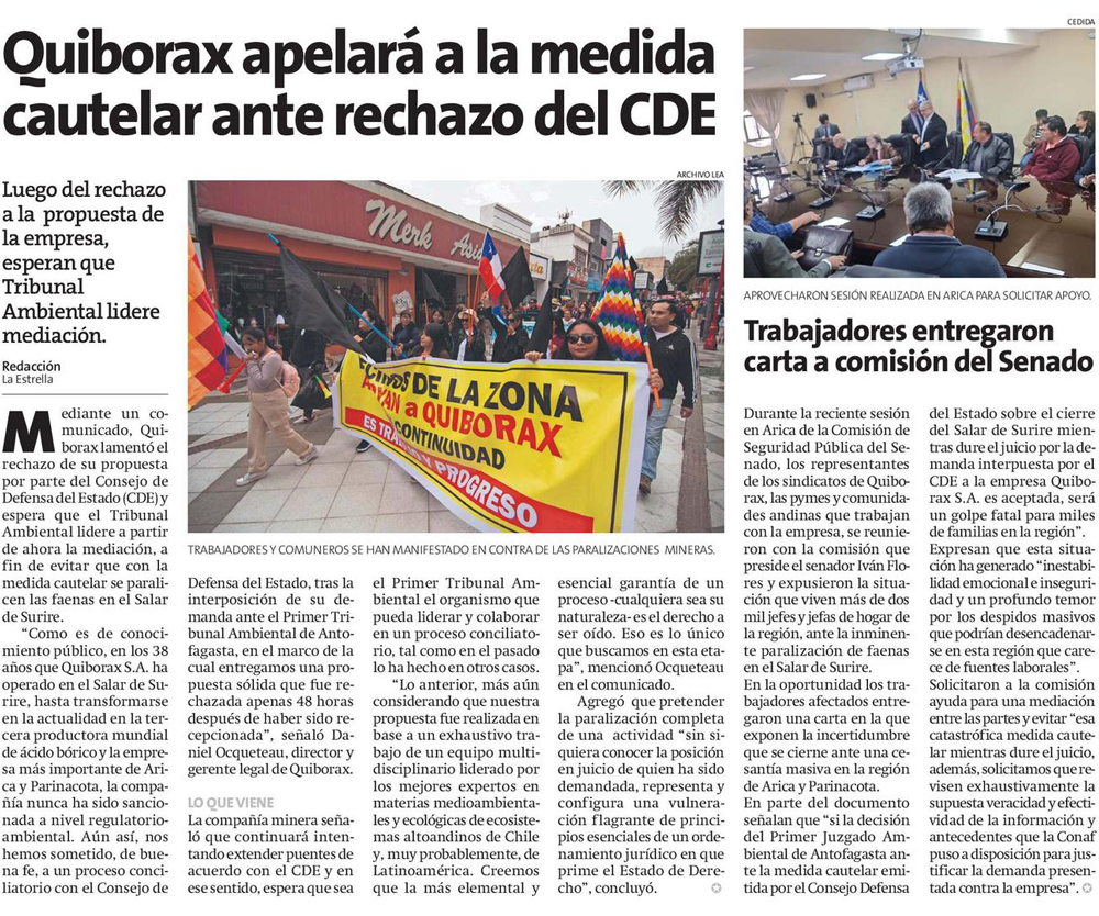 Quiborax lamenta rechazo de propuesta por parte del CDE y espera labor del 1TA - (El Mercurio de Antofagasta)