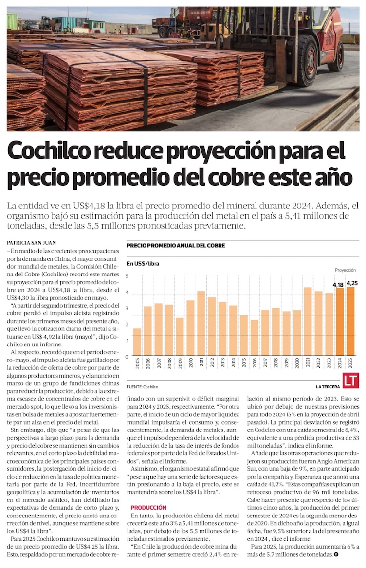 Cochilco ajusta a la baja proyección del precio del cobre - (El Mercurio de Santiago)