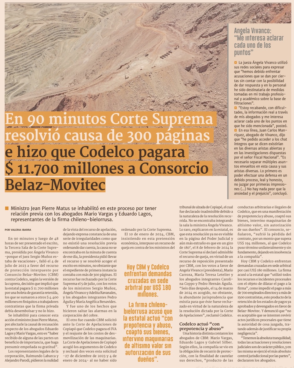 Codelco y consorcio bielorruso: Un fallo rápido, la inhabilidad de Matus y un abogado cercano a Hermosilla - (El Mercurio de Santiago)