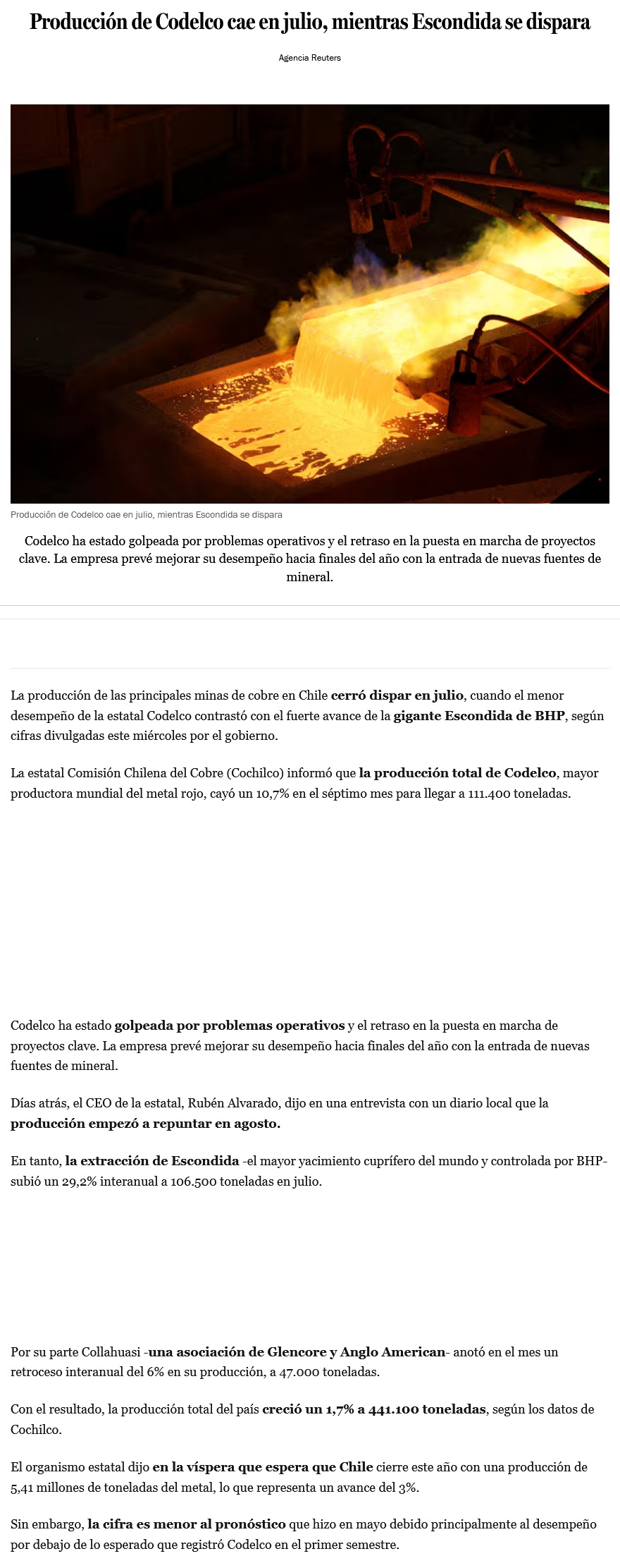 Producción de Codelco volvió a caer en julio mientras que la de Escondida se disparó, según cifras de Cochilco - (DF Online)