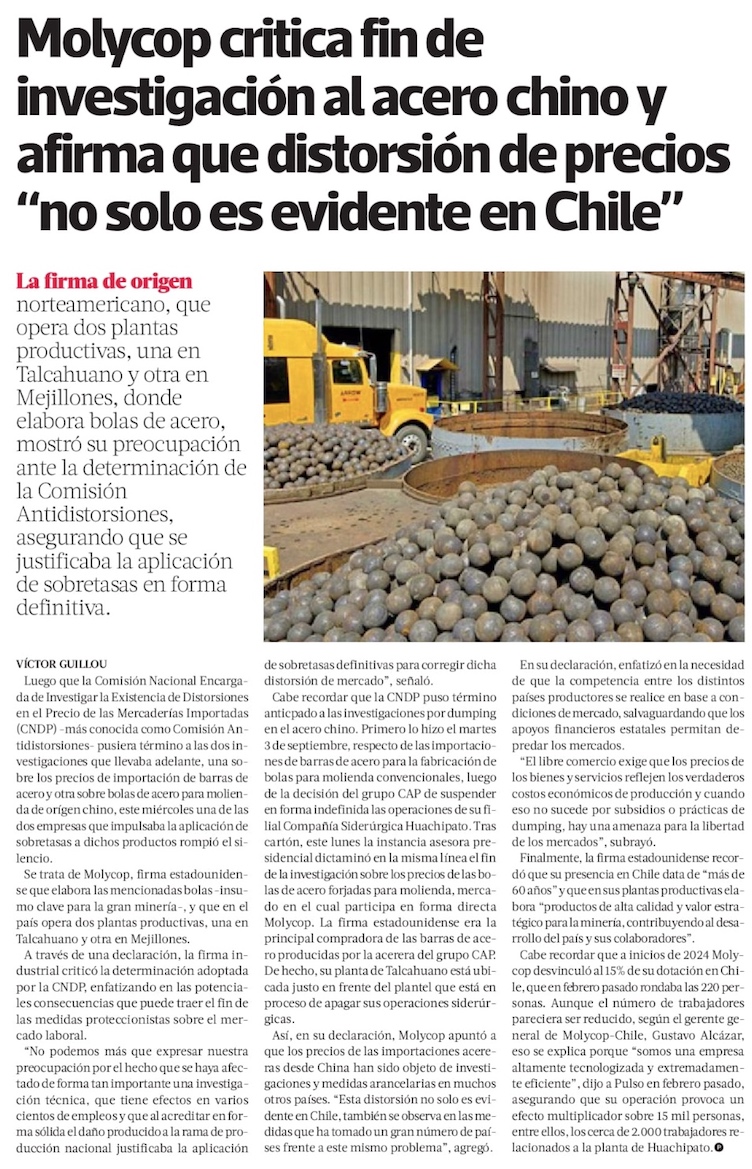 Molycop lamenta decisión de CNDP e insiste en que sí se acreditó dumping - (El Sur)