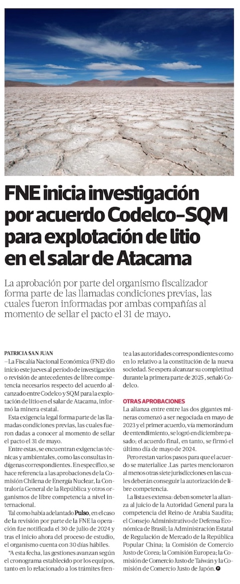 FNE da inicio a investigación por acuerdo SQM-Codelco en litio - (El Mercurio de Santiago)