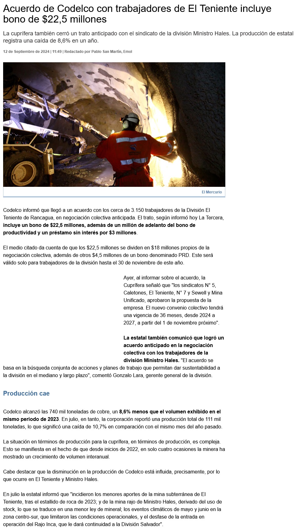 Más de $25 millones en total recibirán los trabajadores de El Teniente tras negociación con Codelco - (biobiochile online)