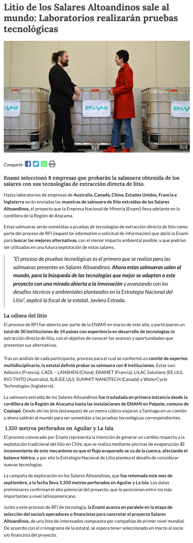 Enami selecciona ocho empresas para probar tecnología en salmueras - (El Mercurio de Calama)