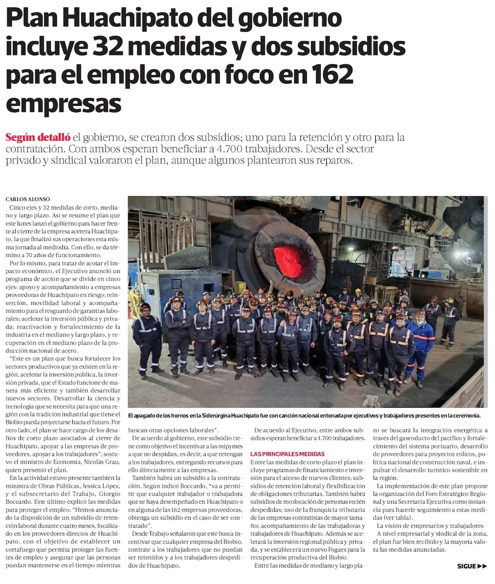 Gobierno busca destrabar US$ 6.800 millones en proyectos de inversión en Biobío para frenar crisis tras cierre de Huachipato - (Diario Financiero)