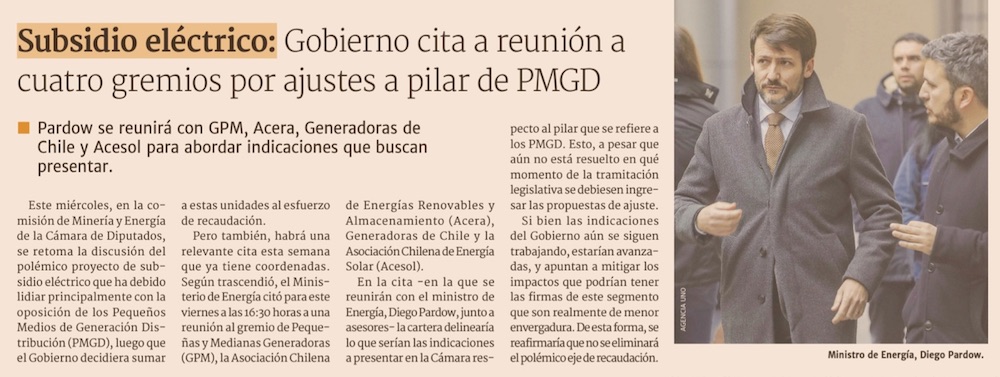 Gobierno analiza una nueva fórmula en su plan de cargos extras a las pequeñas eléctricas - (El Mercurio de Santiago)