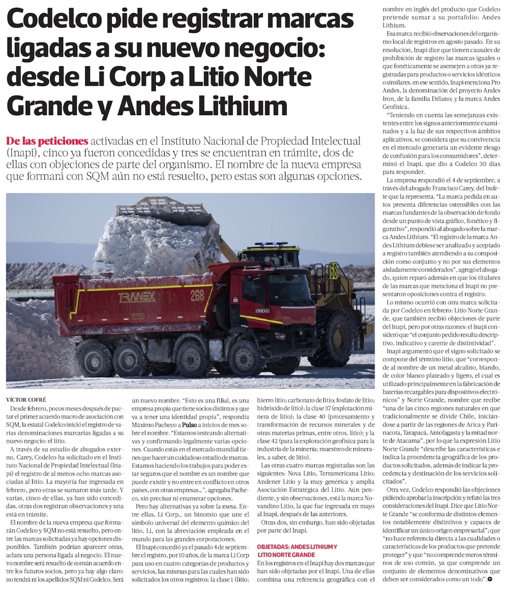 Codelco pide registrar marcas ligadas a su nuevo negocio: desde Li Corp a Litio Norte Grande y Andes Lithium - (La Tercera Online)