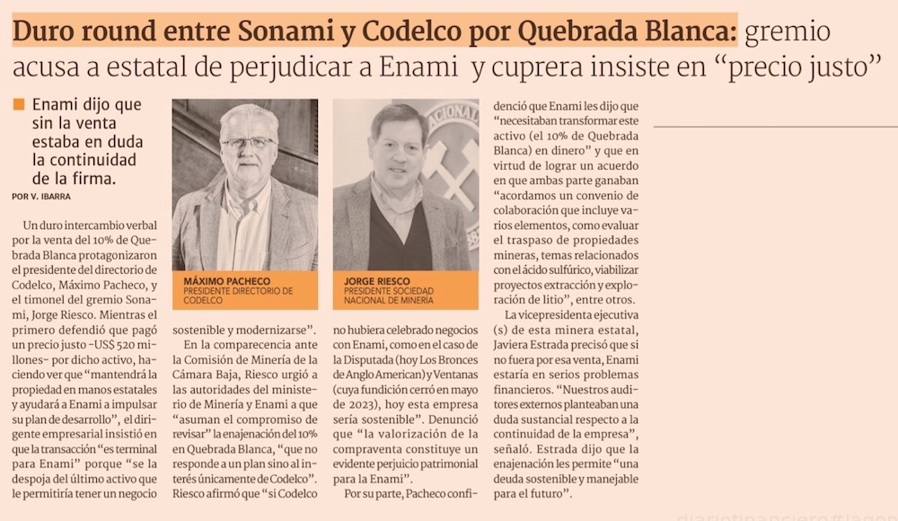 Enami y Codelco defienden en el Congreso el precio pagado por Quebrada Blanca - (Pulso)