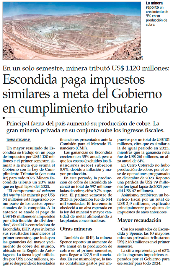 Escondida pagó impuestos en el país por US$1.120 millones el primer semestre influido por alza del royalty - (Pulso)