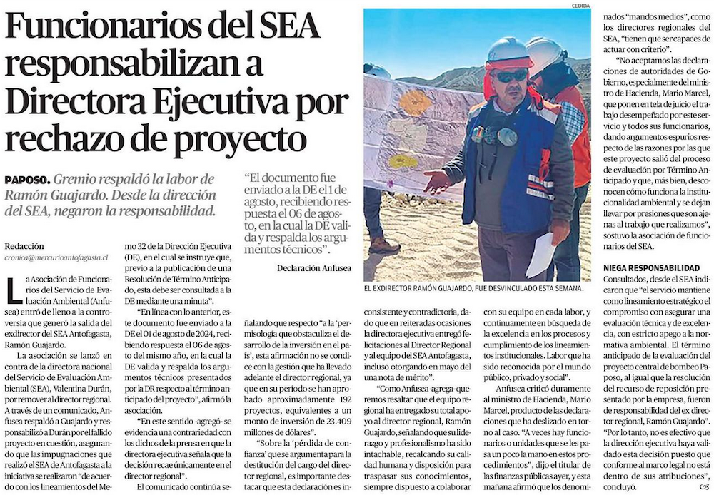 Funcionarios del SEA apoyan al director regional y critican a Durán - (Pulso)