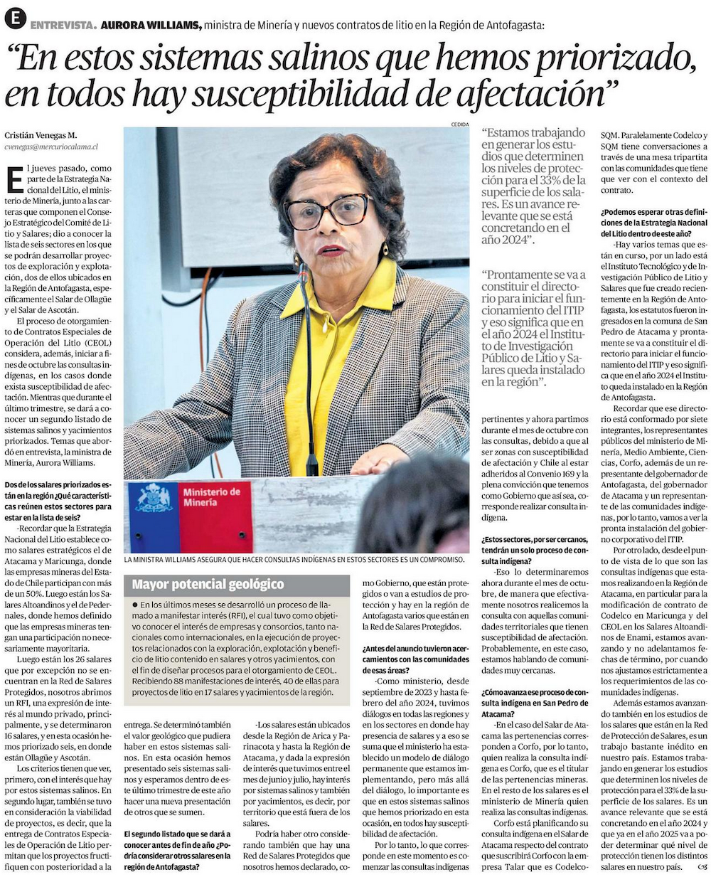 Williams defiende asignación del litio: “Descartamos una condición de arbitrariedad en la decisión” - (El Mercurio de Santiago)