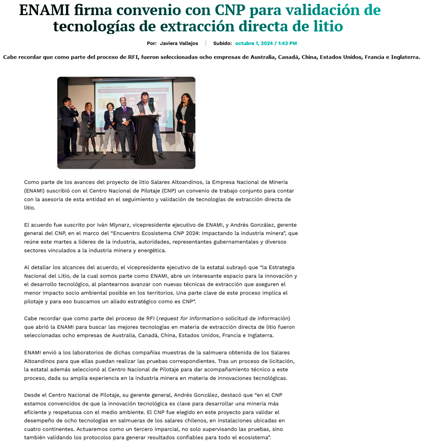 Enami firma convenio con CNP para validación de tecnologías de extracción directa de litio - (portalminero)
