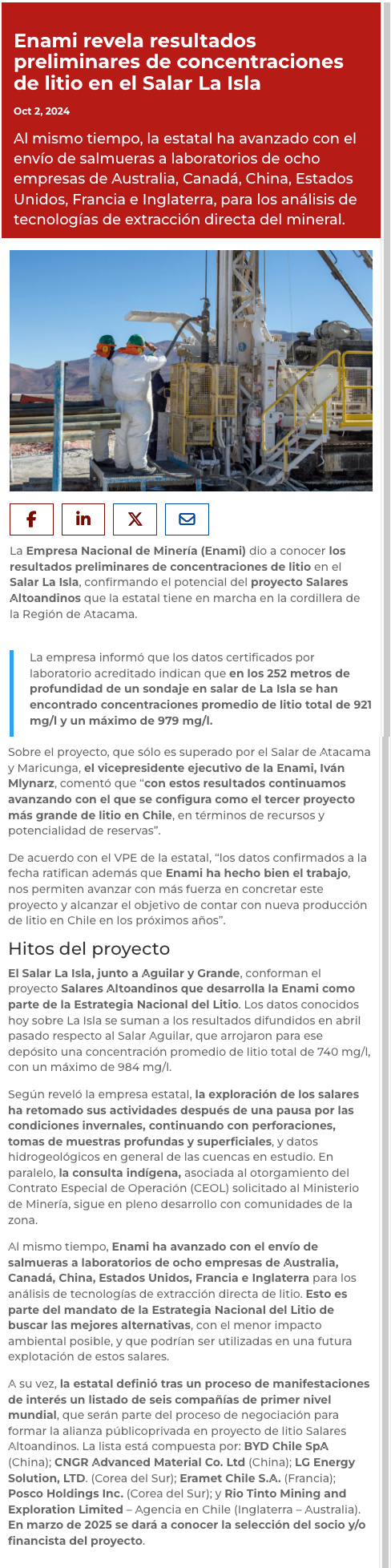 Enami confirma que recursos de Salares Altoandinos lo convierten en el tercer proyecto más grande de litio en Chile - (DF Online)