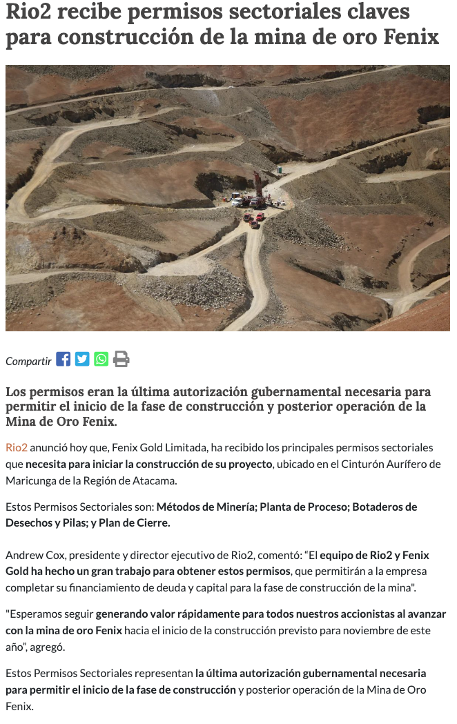 Fenix Gold obtiene permisos sectoriales para construcción - (El Diario de Atacama)