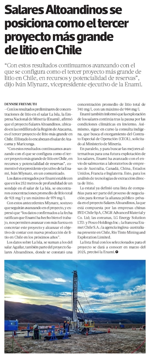 Enami confirma que recursos de Salares Altoandinos lo convierten en el tercer proyecto más grande de litio en Chile - (DF Online)