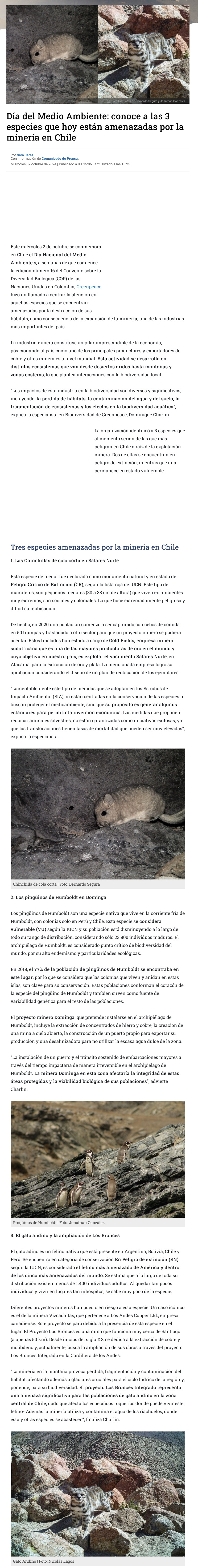 Greenpeace alerta sobre las tres especies acechadas por la minería en el Día Nacional del Medioambiente - (g5noticias.cl)