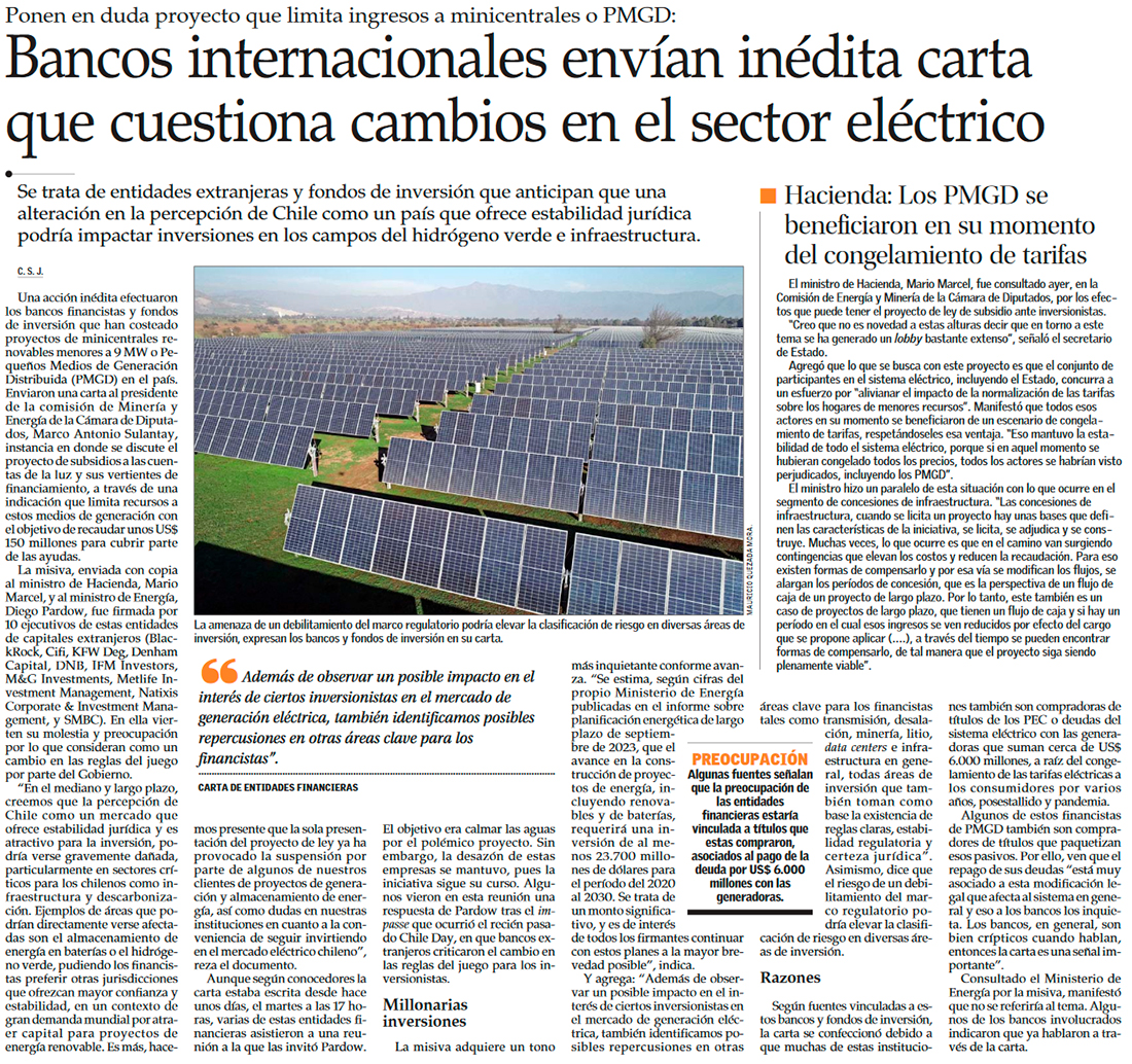 Carta de 10 instituciones financieras a Pardow y Marcel por PMGD: subsidio “podría significar un desincentivo relevante a la inversión” - (Diario Financiero)