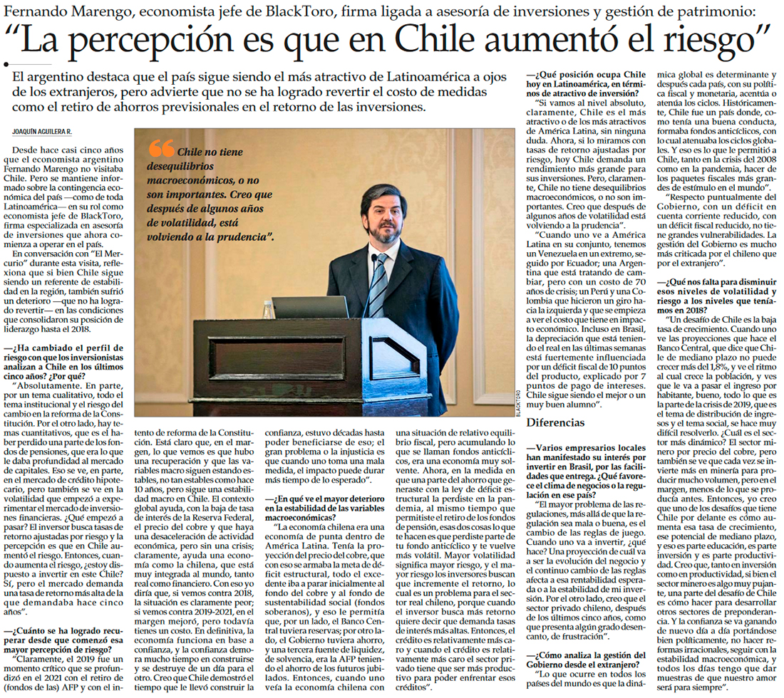 CEO de Credicorp Capital y su visión de Chile: “Los retos vienen por el crecimiento (económico)” - (El Mercurio de Santiago)