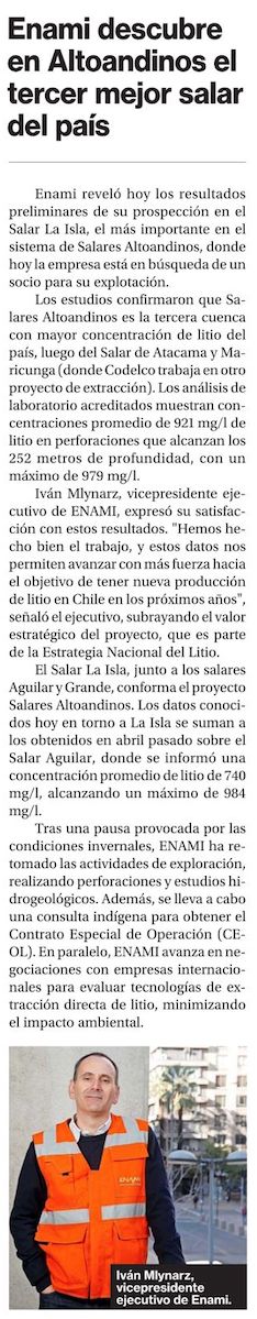 Enami confirma que recursos de Salares Altoandinos lo convierten en el tercer proyecto más grande de litio en Chile - (DF Online)