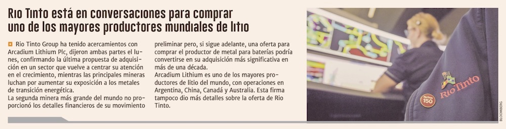 Litio: Rio Tinto busca comprar Arcadium - (Pulso)
