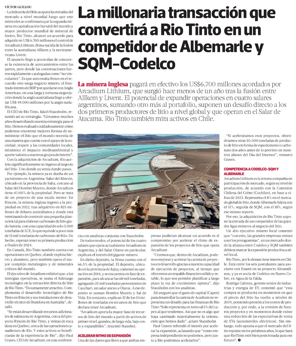 Rio Tinto compra Arcadium en US$ 6.700 millones y se convierte en la única gran productora de litio que no opera en Chile - (Diario Financiero)