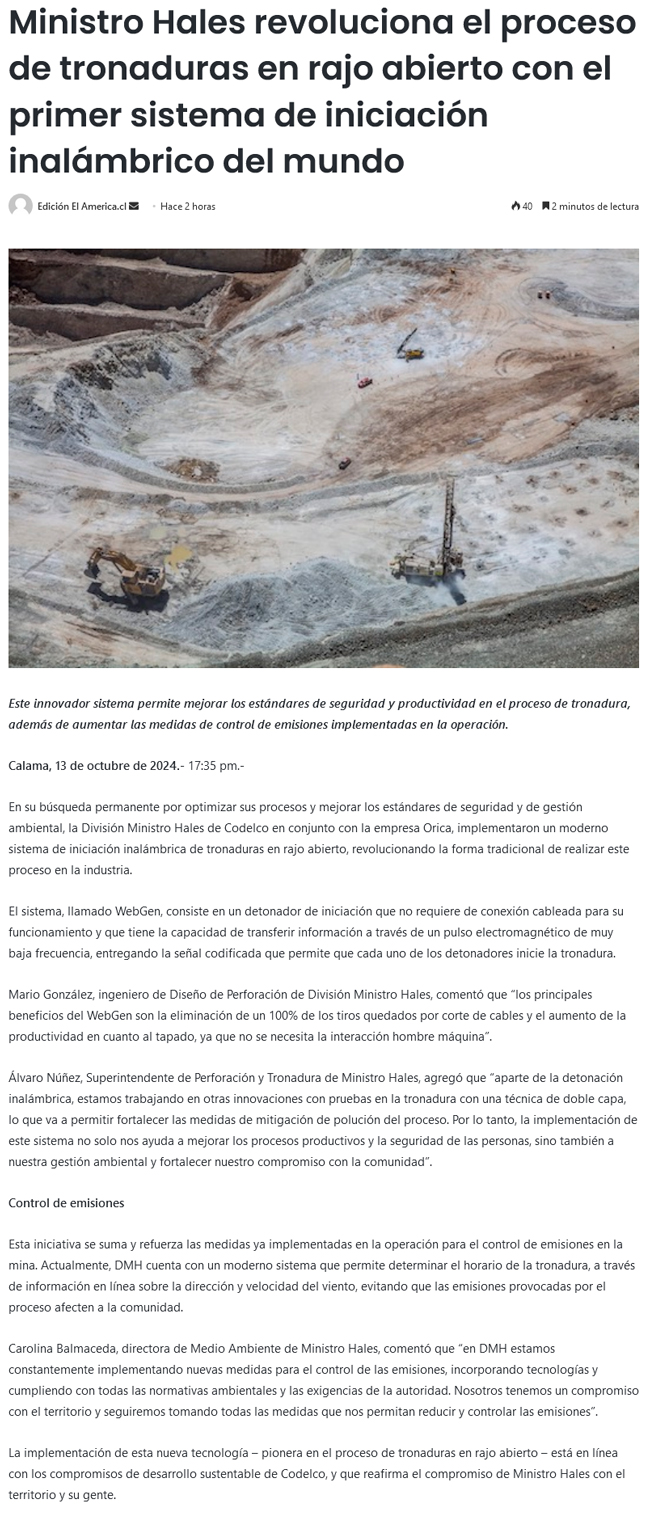 División Ministro Hales revoluciona el proceso de tronaduras en rajo abierto - (El Mercurio de Calama)