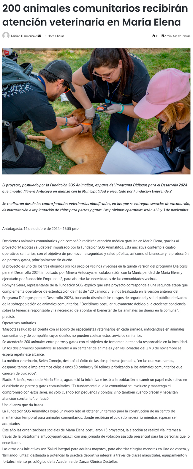 Antucoya: 200 animales comunitarios recibirán atención veterinaria - (El Mercurio de Calama)