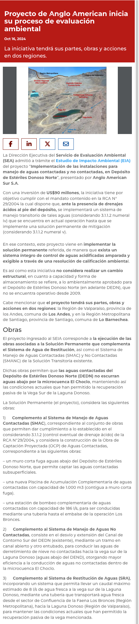 Anglo American invertirá US$90 millones para contener aguas - (La Segunda)