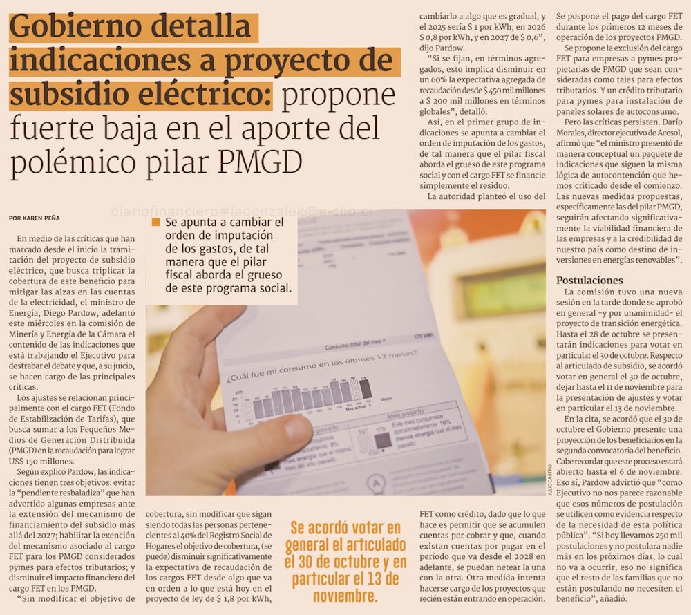 Subsidio eléctrico: Energía propone reducir a menos de la mitad aporte de PMGD e incorpora crédito para generadoras, pero no convence a gremios - (Pulso)