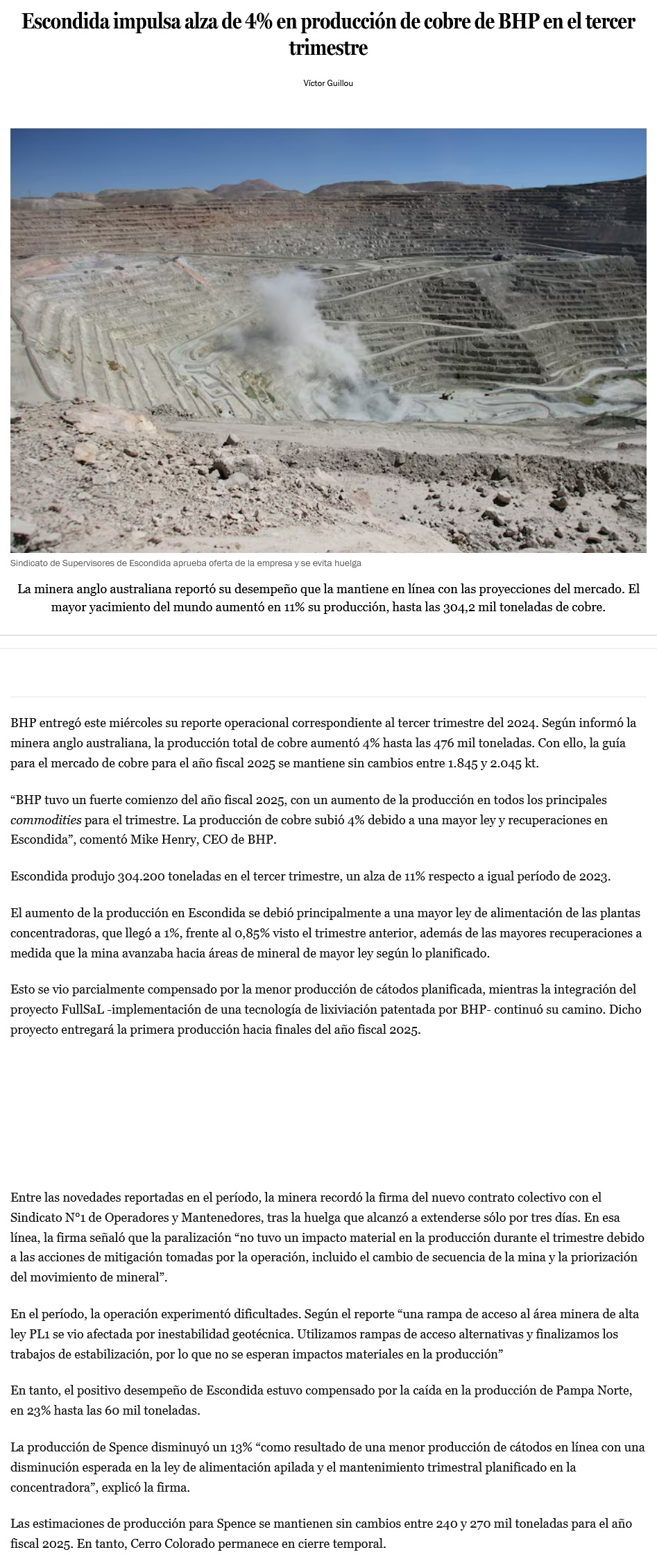 BHP reporta alza de 4% en producción de cobre en su primer trimestre fiscal: Escondida registró un aumento de 11% - (DF Online)
