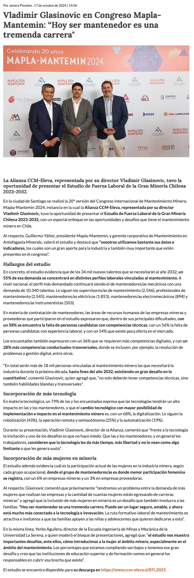 Alianza CCM-Eleva visibilizó las oportunidades del mantenimiento minero en Congreso Mapla-Mantemin 2024 - (portalminero)