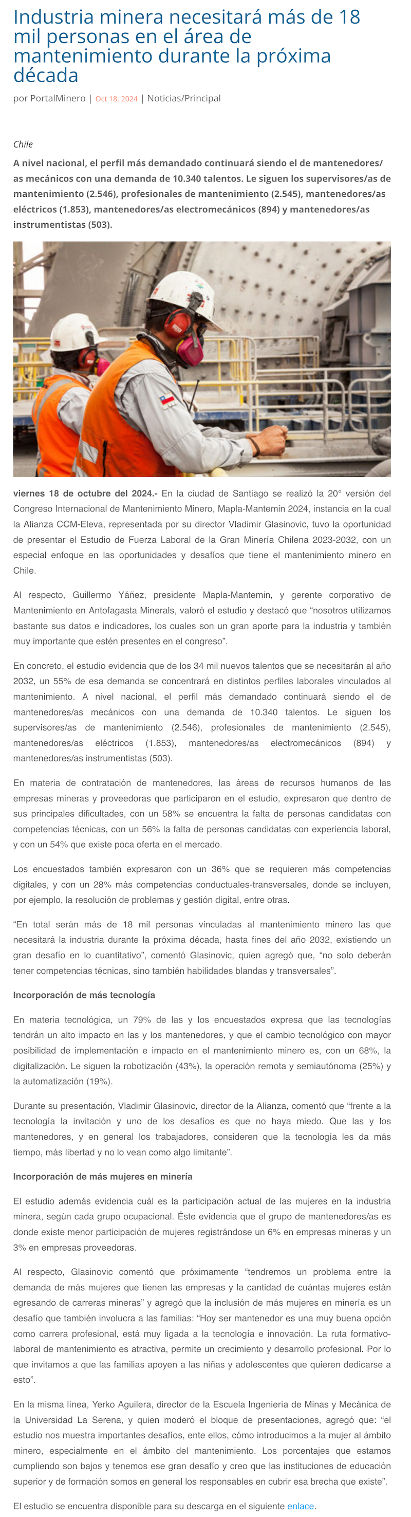 En total serán más de 18 mil personas vinculadas al mantenimiento minero las que necesitará la industria durante la próxima década - (tierramarillano.cl)
