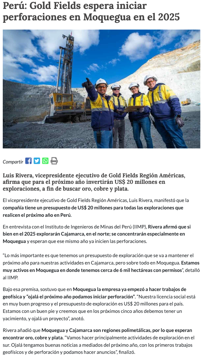 Minera Gold Fields invertirá US$ 20 millones en Perú para 2025 - (Diario Financiero)