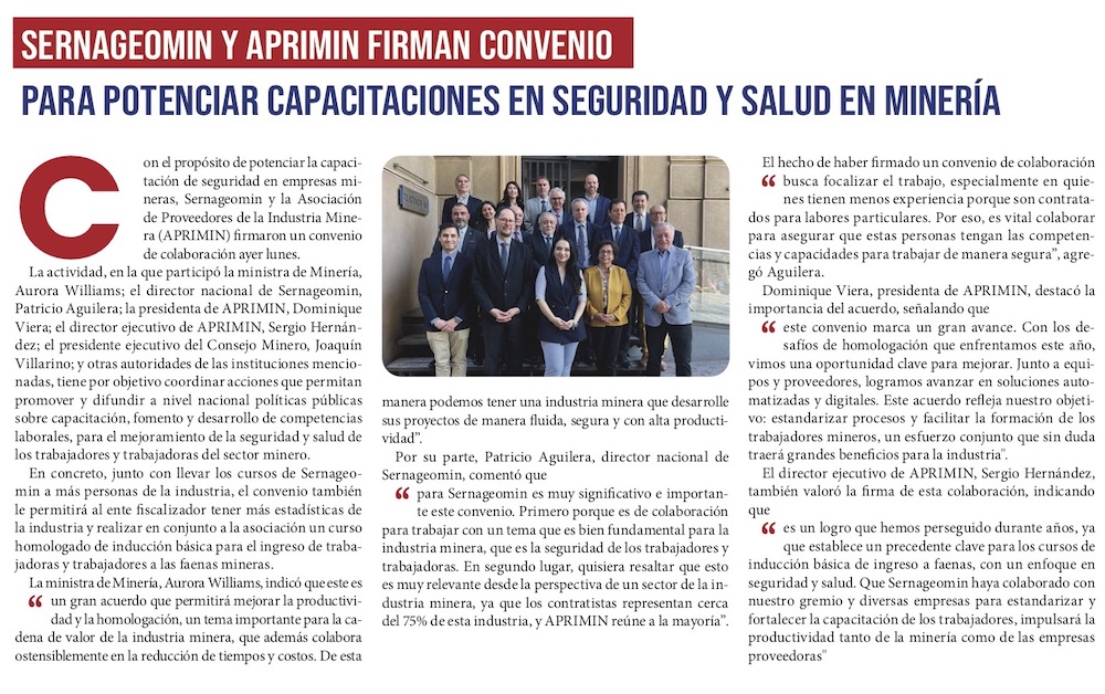 Sernageomin y Aprimin firman convenio para potenciar capacitaciones en seguridad y salud en minería - (nuevaminería online)