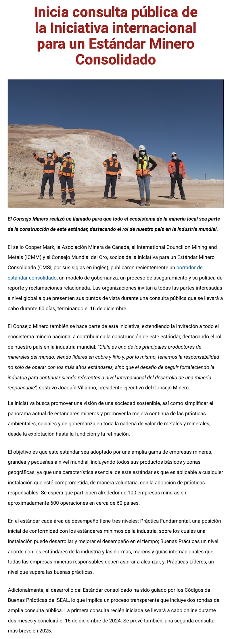 Inicia consulta pública de la Iniciativa internacional para un Estándar Minero Consolidado - (portalinnova.cl)