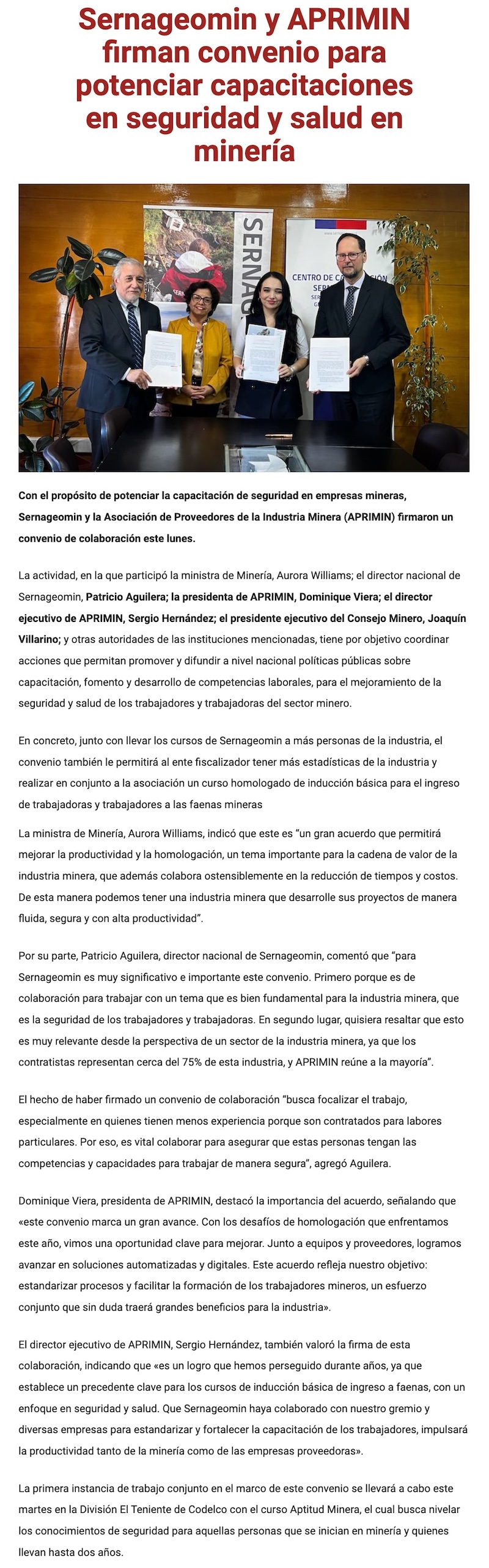 Sernageomin y Aprimin firman convenio para potenciar áreas de seguridad y salud en minería - (mch.cl)