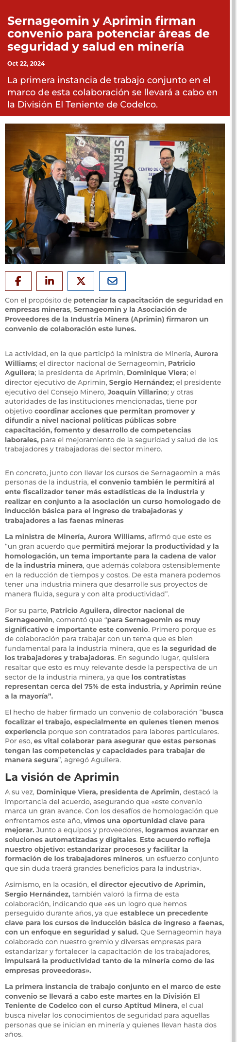 Sernageomin y APRIMIN firman convenio para potenciar capacitaciones en seguridad y salud en minería - (madero.cl)